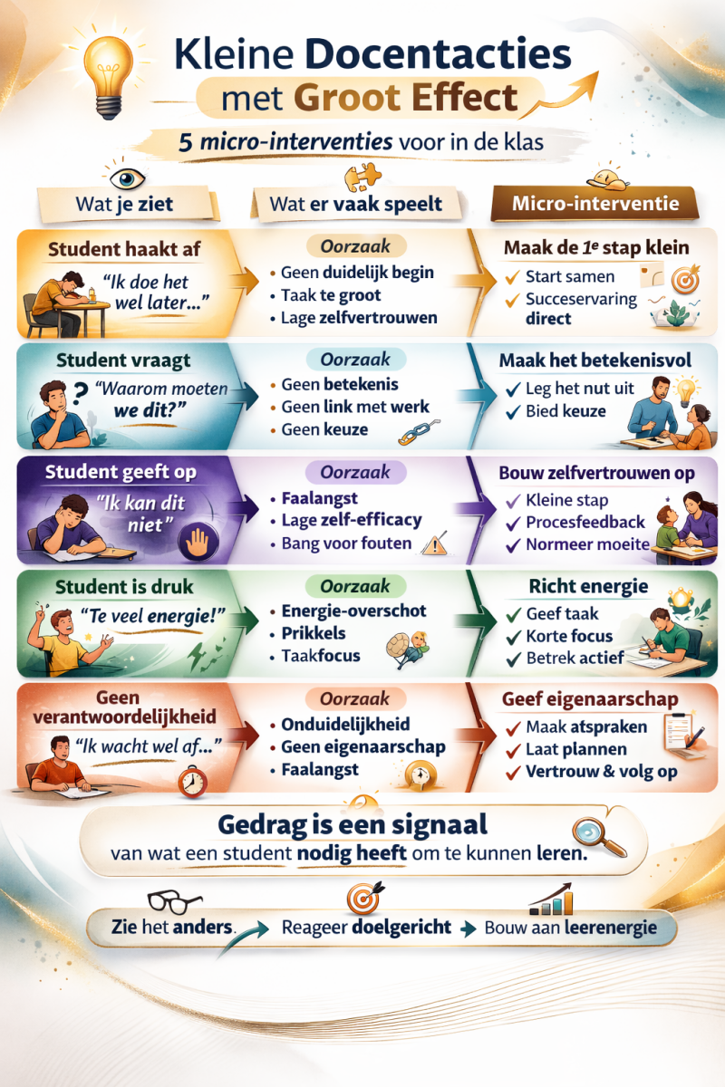 De autonomiekaart helpt studenten om zelf een volgende stap te kiezen in hun leerproces. Met drie eenvoudige keuzes — wat heb ik nodig, wat kies ik nu en welke kleine stap zet ik? — ervaren studenten invloed en duidelijkheid. De kaart ondersteunt docenten in het voeren van rustige, gerichte micro‑gesprekken waarin zelfstandigheid en structuur hand in hand gaan.